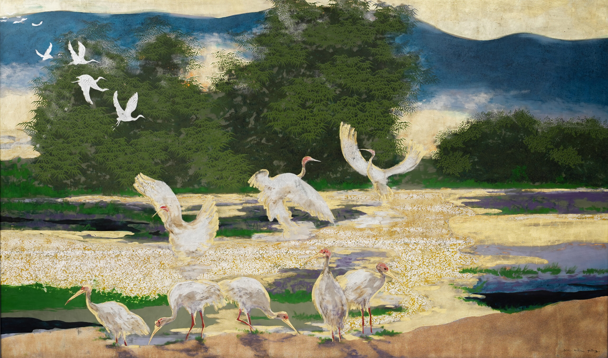 Morning on the Cổ Cò River depicts a gathering of đàn cò (storks) at dawn, a bird traditionally associated with harmony and prosperity. The work reflects both the serenity of the setting and the artist’s engagement with scale, format, and compositional openness during this period.